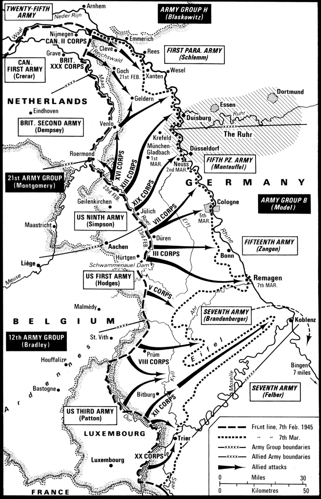 The fastest and easiest way across was obviously via bridges. But most had been destroyed by Allied bombing or the retreating Germans. And Hitler had ordered the last few still standing to be blown sky high when the Allies were just about to cross. He also designated key towns and cities along the Rhine as fortresses, to be defended to the last man.